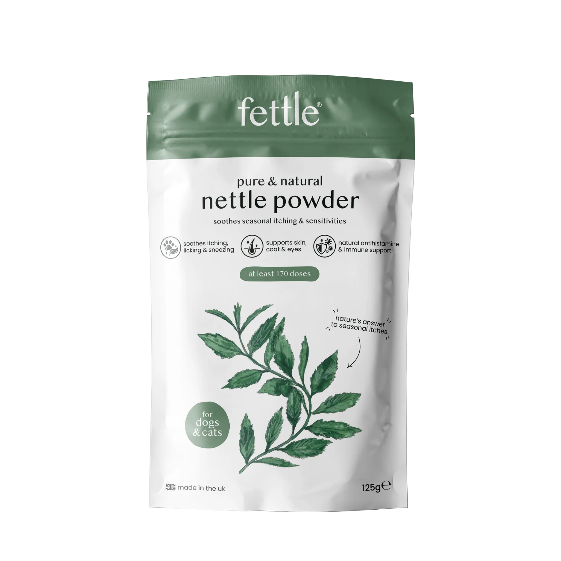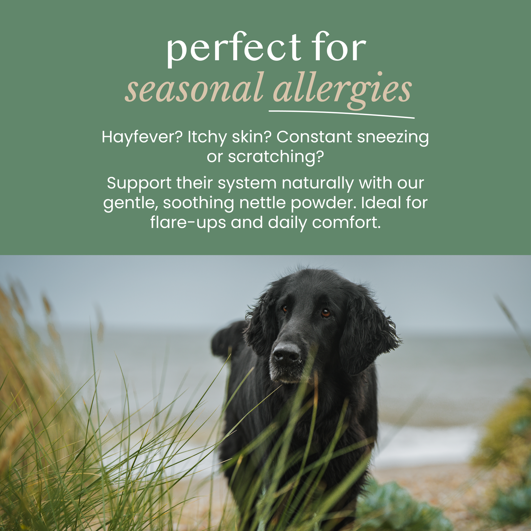 Stir 1–2 tbsp nettle powder into 500ml freshly boiled water. Cover and steep for 10–15 minutes. Strain through a fine sieve or muslin and let cool to lukewarm. Pour over your dog’s coat or sponge on. Do not shampoo after use, allow to air dry for best results.